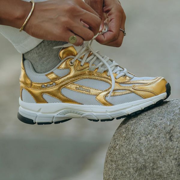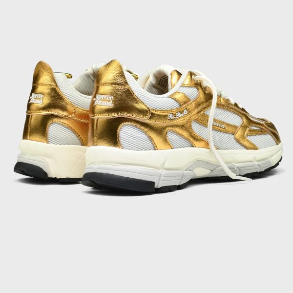• De sneaker van Mercer Amsterdam in de kleur goud is gemaakt van gerecyceld materiaal.