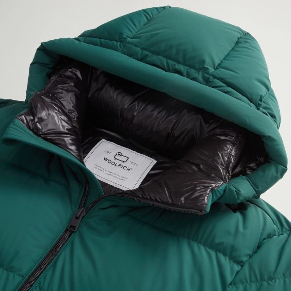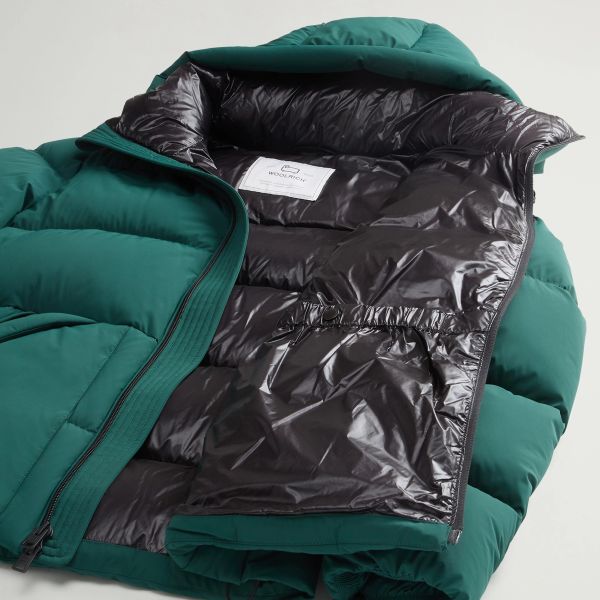• De jas van Woolrich in de kleur groen is gemaakt van polyamide en elastaan.
